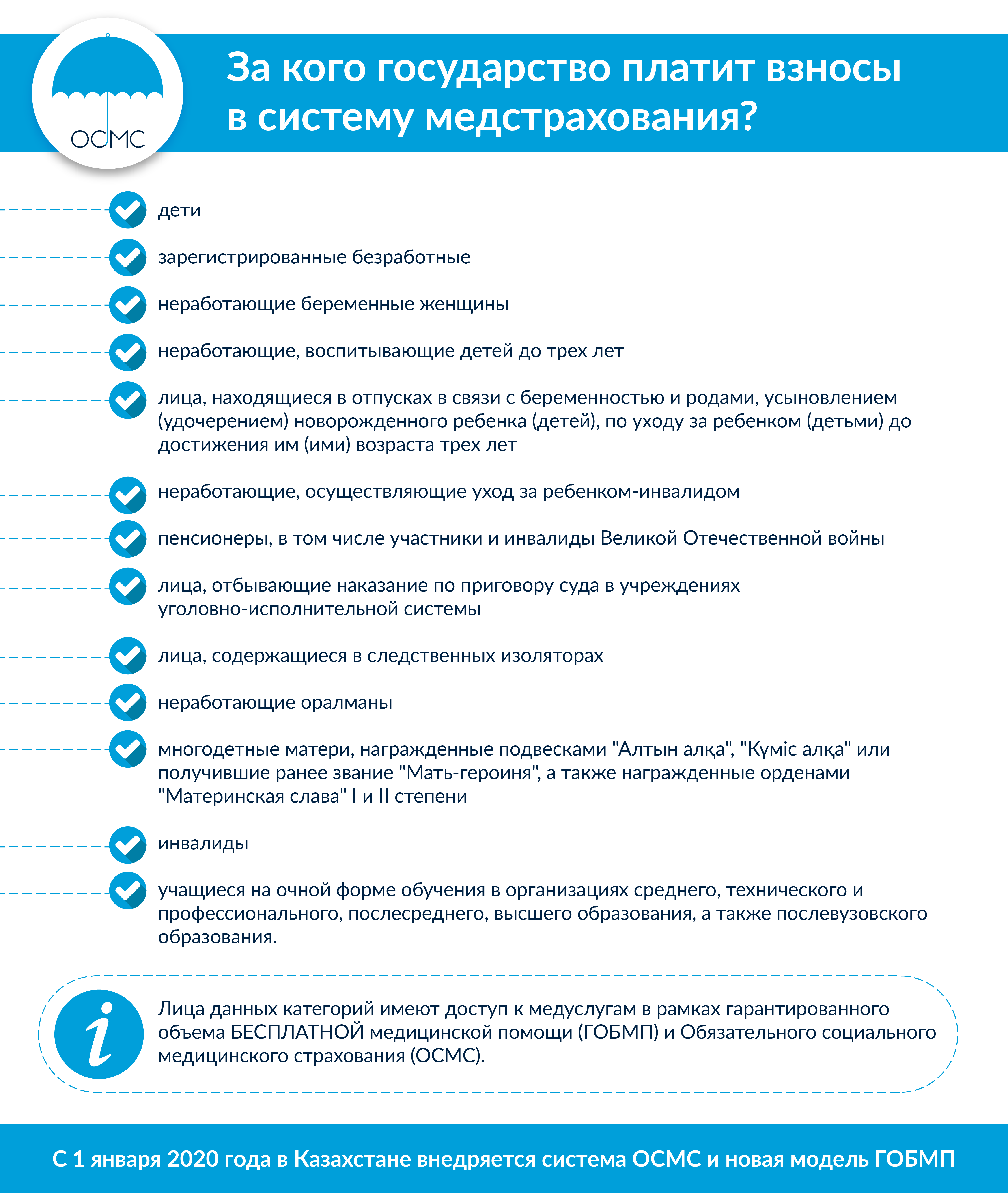 С 1 января 2020 года в Казахстане вступает в силу система обязательного медицинского страхования. Вы знаете, как будете получать медпомощь по страховке и что надо сделать для участия в системе ОСМС? Зайдите на сайт fms.kz или позвоните на бесплатный номер 1414 и узнайте подробности. Также можете обратиться за консультацией по ОСМС в свою поликлинику.